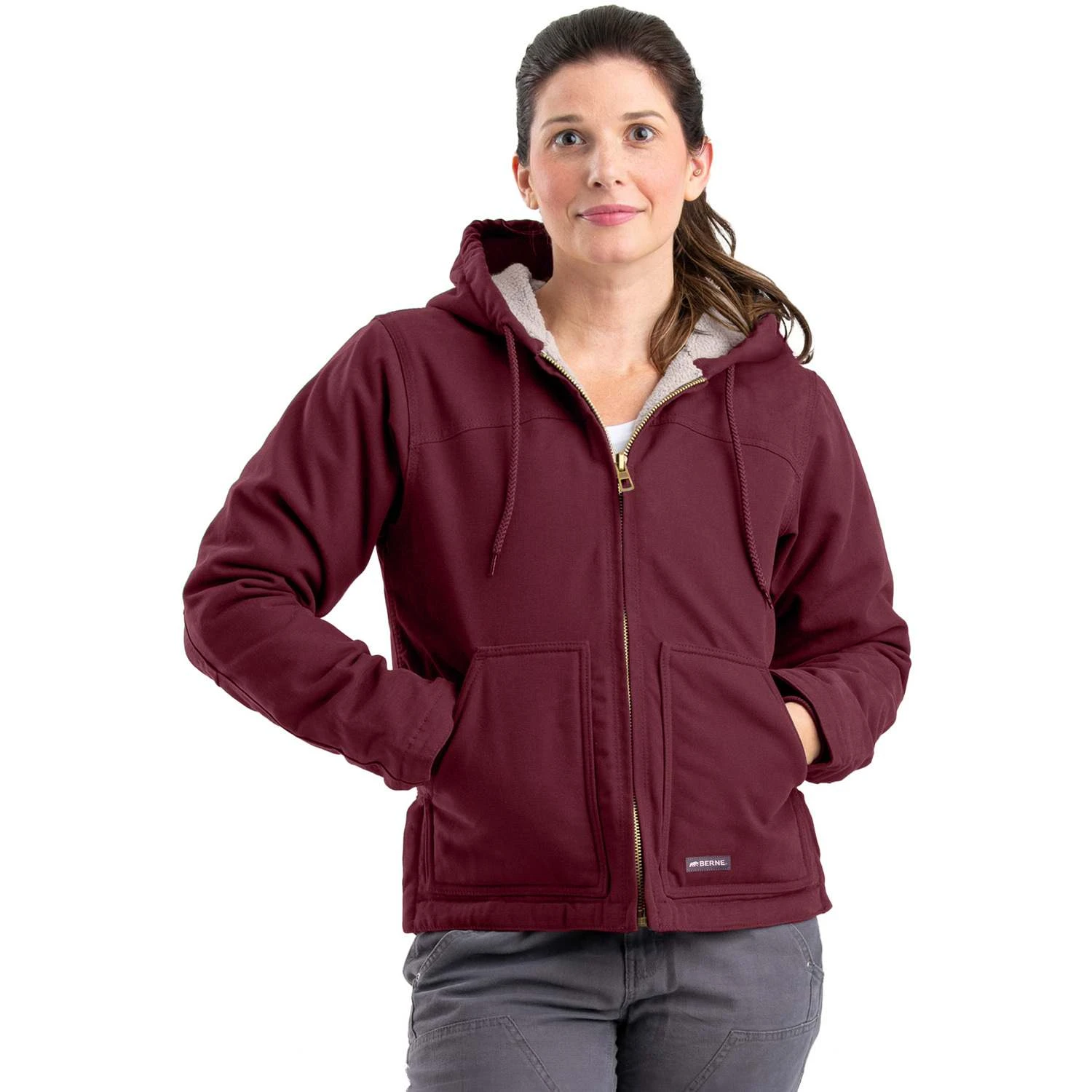 With heavy-duty 100% cotton sanded duck fabric and super-warm 100% polyester fine sherpa lining for insulation this Berne® WHJ43 Ladies Washed Hooded Coat has what it takes to get you through the coldest days.